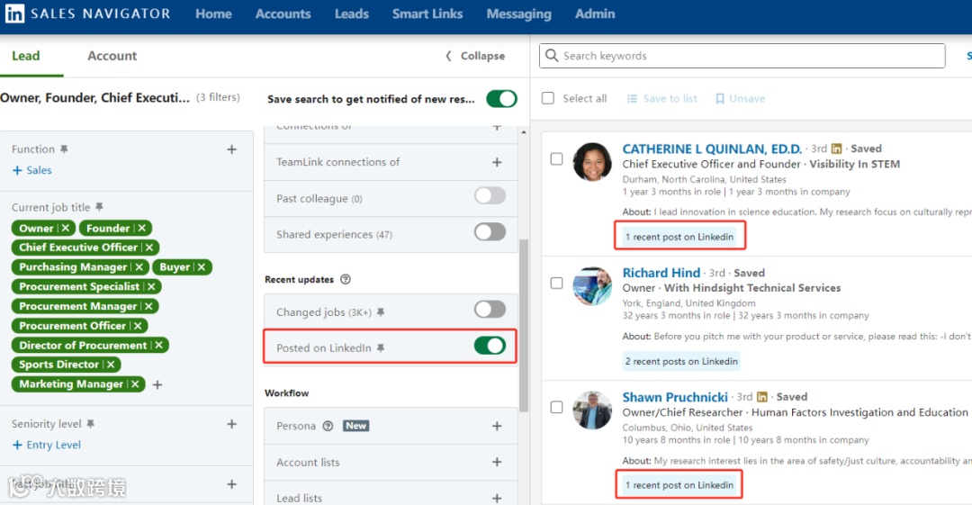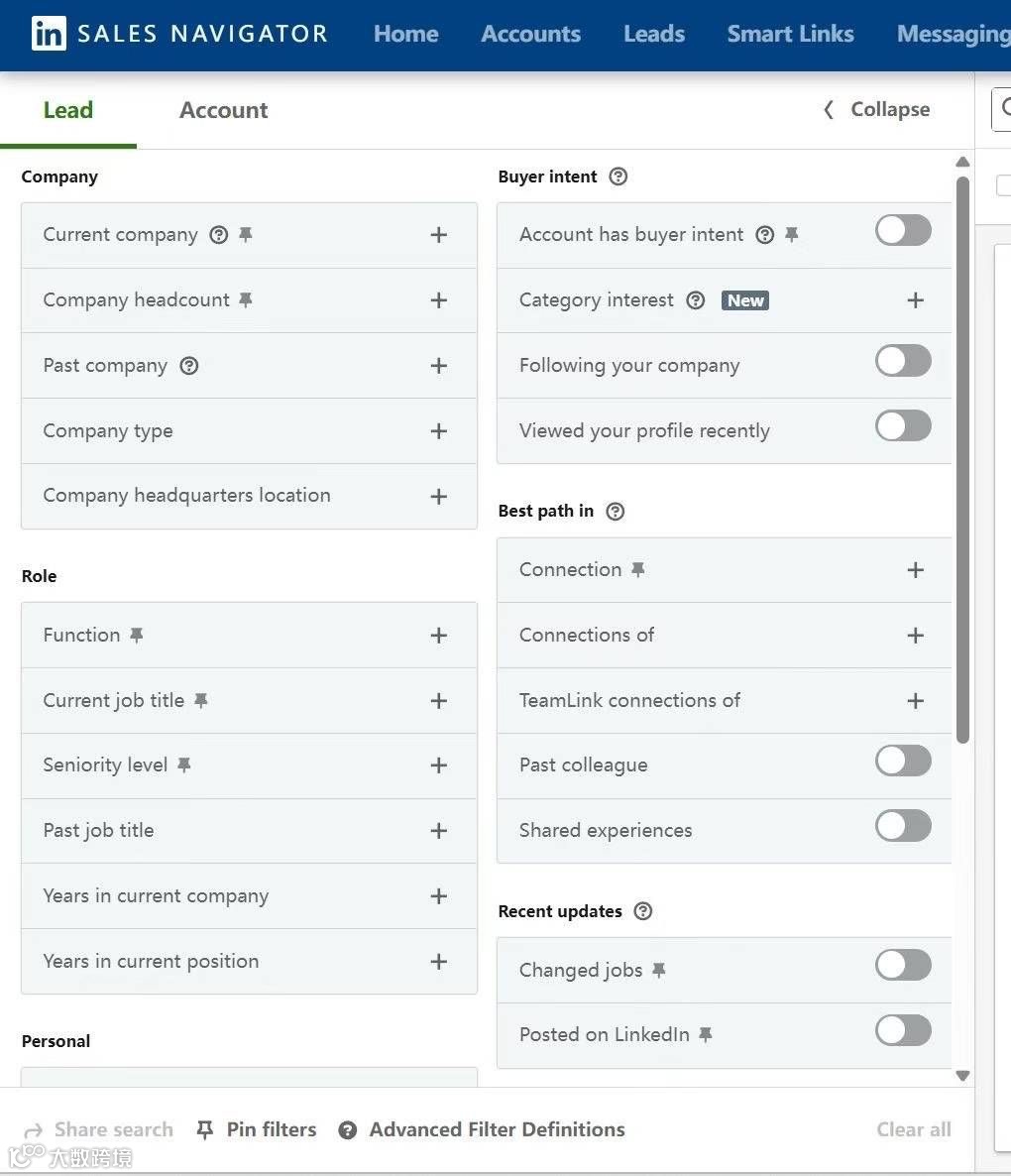 如图所示,Sales Navigator支持无限制、多维度精准客户查找。