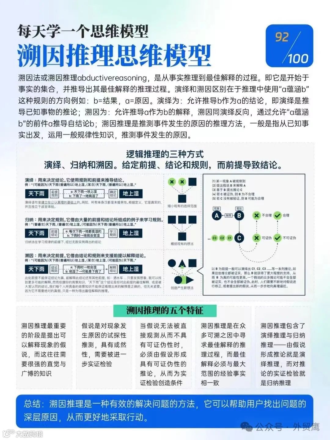 溯因推理是一种从结果推断原因的思维方式,为外贸销售人员提供了系统化工具,帮助其深入挖掘客户需求背后的根本动因,提升沟通效率与成交率。