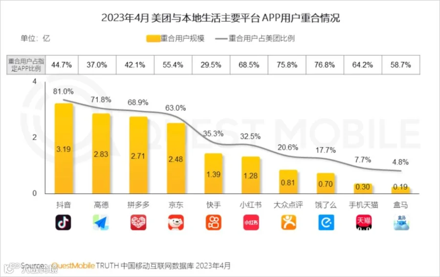 之所以这么做,是因为美团与抖音重合度太高。据第三方机构QuestMobile发布的《2023年本地生活服务行业洞察》显示,抖音与美团重合用户规模超3亿,重合用户占美团总体用户的81%。