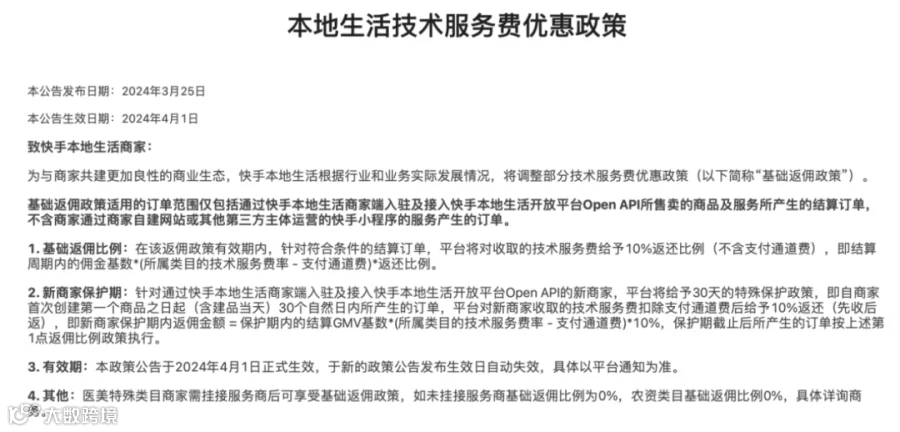此外,在技术服务费方面,快手只收取1-2%的费率外,在2023年7月开始按照60%的比例向符合标准的商家返还技术服务费,2024年4月1日起返还比例下降到了10%。