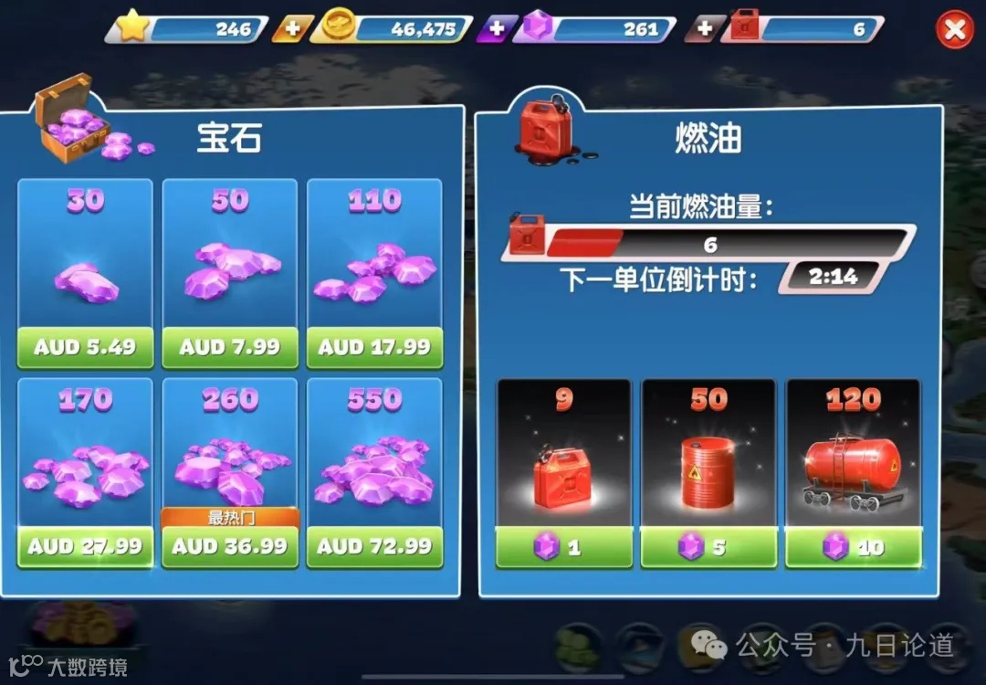 很快,玩家从刚开始的游刃有余变得手忙脚乱,不得不通过升级机上餐厅的设备和食品配料来通关,或者取得三星。但是升级所需要的资源越来越多,而其自然积累(不氪金)却越来越慢,最终必然走向供不应求的状况。除了“硬通货”,另一重要资源便是燃油,游戏设定每关游戏每次打开都需要消耗10桶燃油,10分钟后自然恢复一桶燃油,而油箱自动恢复到50封顶(只能玩5关游戏)的设定注定了无法满足那些在各种pk(要求在短时间内完成一定数量关卡)中杀红了眼的疯狂空姐。山重水复疑无路,但在游戏商城,只要有钱,下一秒就是柳暗花明又一村了。
