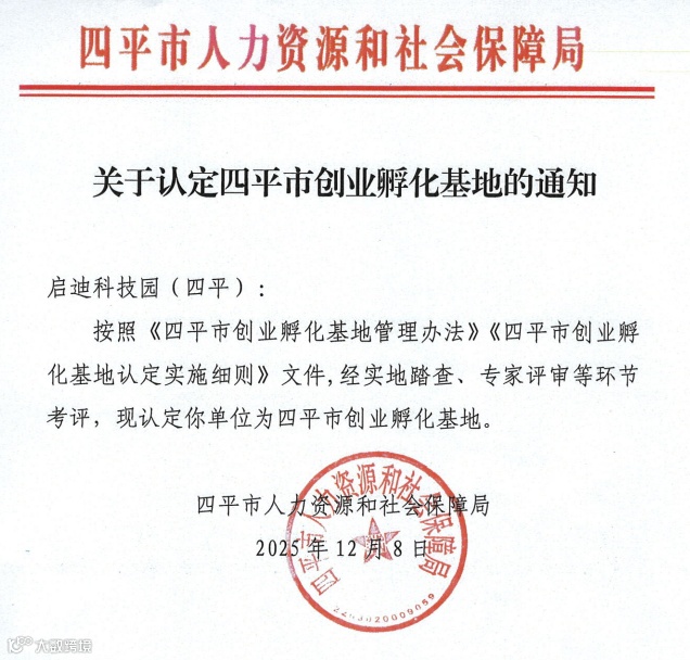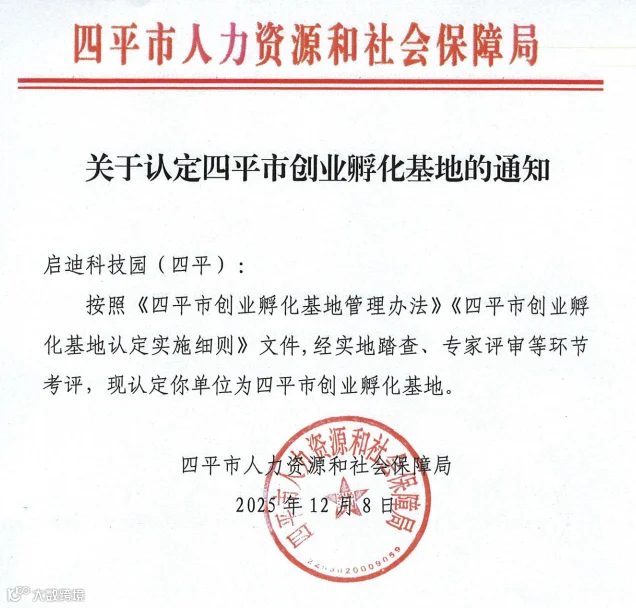 关于认定四平市创业孵化基地的通知》,启迪科技园(四平)被成功认定为四平市创业孵化基地。