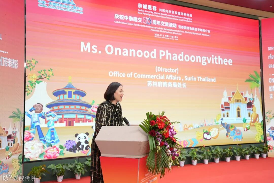 12月2日,“亲诚惠容·共拓内外贸双循环新格局——庆祝中泰建交50周年交流活动暨泰国特色商品专场推介会”在中国—东盟特色商品汇聚中心隆重举办。本次活动由泰国商业部、泰国商业部国际贸易促进司、中国国际贸易促进委员会广西壮族自治区分会、中国—东盟商务理事会联席秘书处、中国—东盟特色商品汇聚中心(简称“汇聚中心”)联合主办,中国国际商会广西商会、中国检验认证集团广西有限公司、广西达译科技有限公司、迈越科技股份有限公司、方圆标志认证集团广西有限公司作为支持单位参与此次活动。
