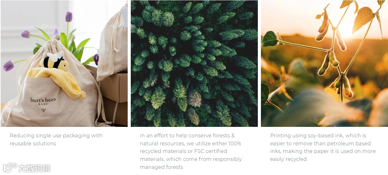 Burts Bees Baby除了采用纯天然材料如有机棉,来制作衣服以外,其还对产品外包装进行了改革。Burts Bees Baby不仅采用100%回收材料或FSC认证材料来制作外包装,在印刷方面,也采用了大豆油墨,以使油墨更容易被去除。