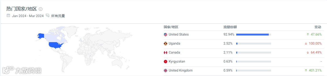 按区域分析:在全球范围内,美国儿童服装市场收入最高,预计2024年,美国儿童服装市场收入将达到540亿美元。值得注意的是,虽然全球经济低迷,但美国对高质量儿童服装的需求仍然强劲。根据similarweb数据显示,Burts Bees Baby官网的流量中,92.94%都来自于美国,可见其就是以美国为主要目标市场的。