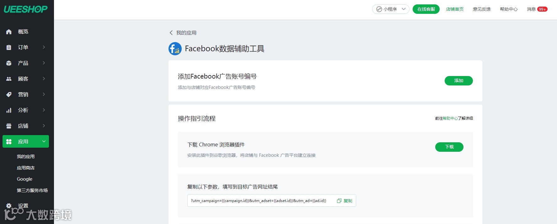 Ueeshop Facebook数据辅助功能,可以帮助卖家更加准确获取Facebook渠道各个广告系列、广告组和广告的转化数据和ROI。卖家根据这些数据,可以更加及时、准确地调整投放方向和预算,从而提升广告整体的转化率。
