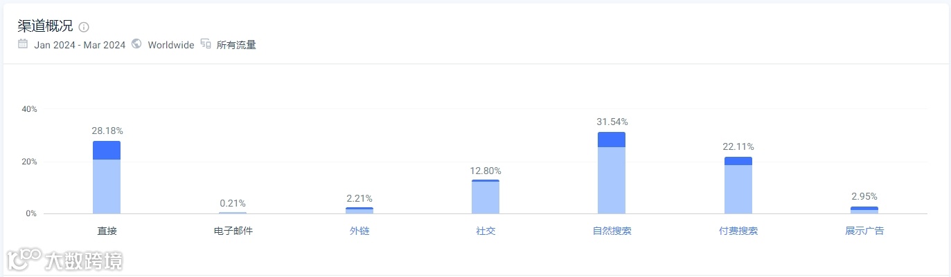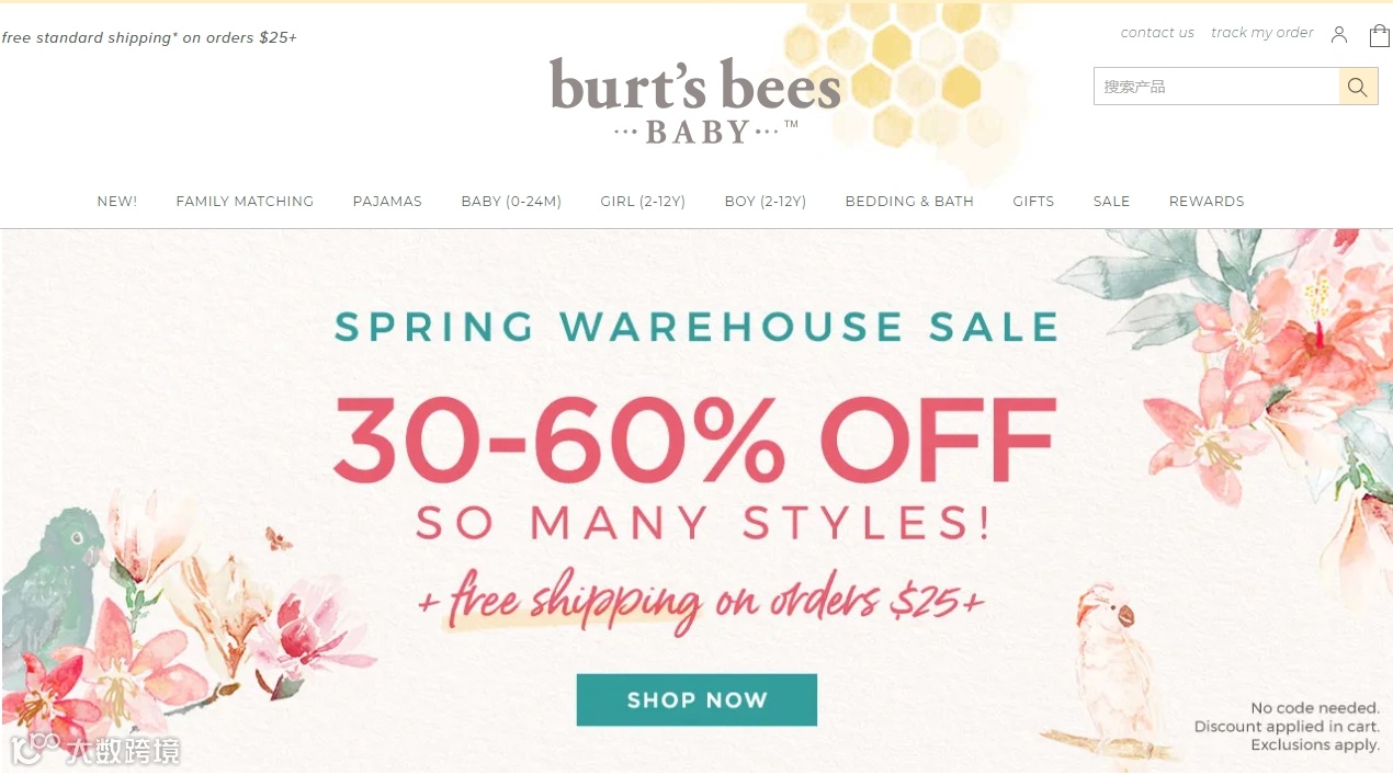 根据similarweb数据显示,Burts Bees Baby官网的流量主要来自于自然搜索流量(31.54%)、直接访问流量(28.18%)、付费搜索(22.11%)、社交媒体(12.8%)。