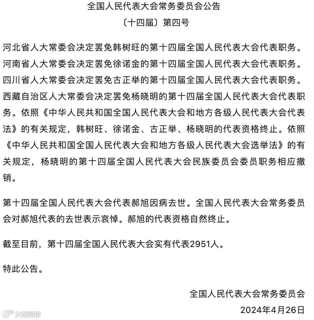 据澎湃新闻,全国人民代表大会常务委员会4月26日公告提到,西藏自治区人大常委会决定罢免杨晓明的第十四届全国人民代表大会代表职务。依照《中华人民共和国全国人民代表大会和地方各级人民代表大会代表法》的有关规定,杨晓明的代表资格终止。