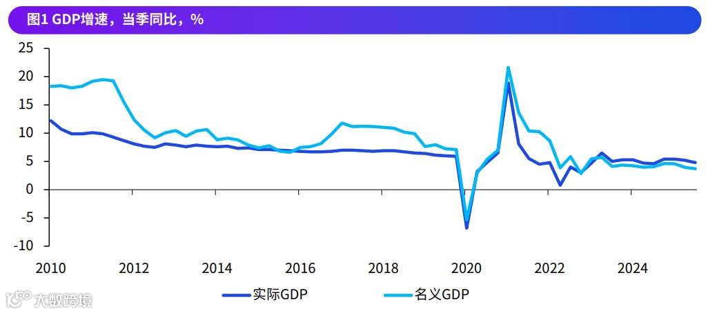 2025年前三季度中国经济实际GDP同比增长5.2%,完成全年5%左右增长目标的进度良好,但三季度增速回落至4.8%,呈现“前高后低”特征。