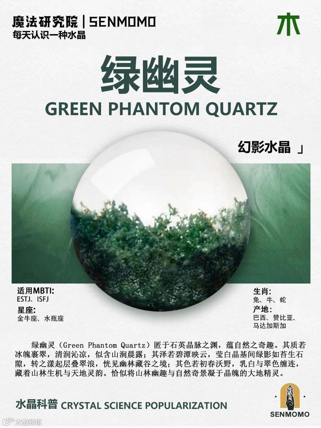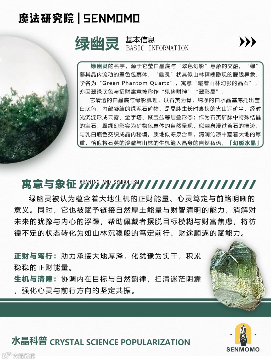 绿幽灵的幻影结构象征层层堆叠的经历,让人反思过去、展望未来。它能增强直觉力与洞察力,帮助你在人生转换期(如转职、搬家或感情变化)中找到方向。