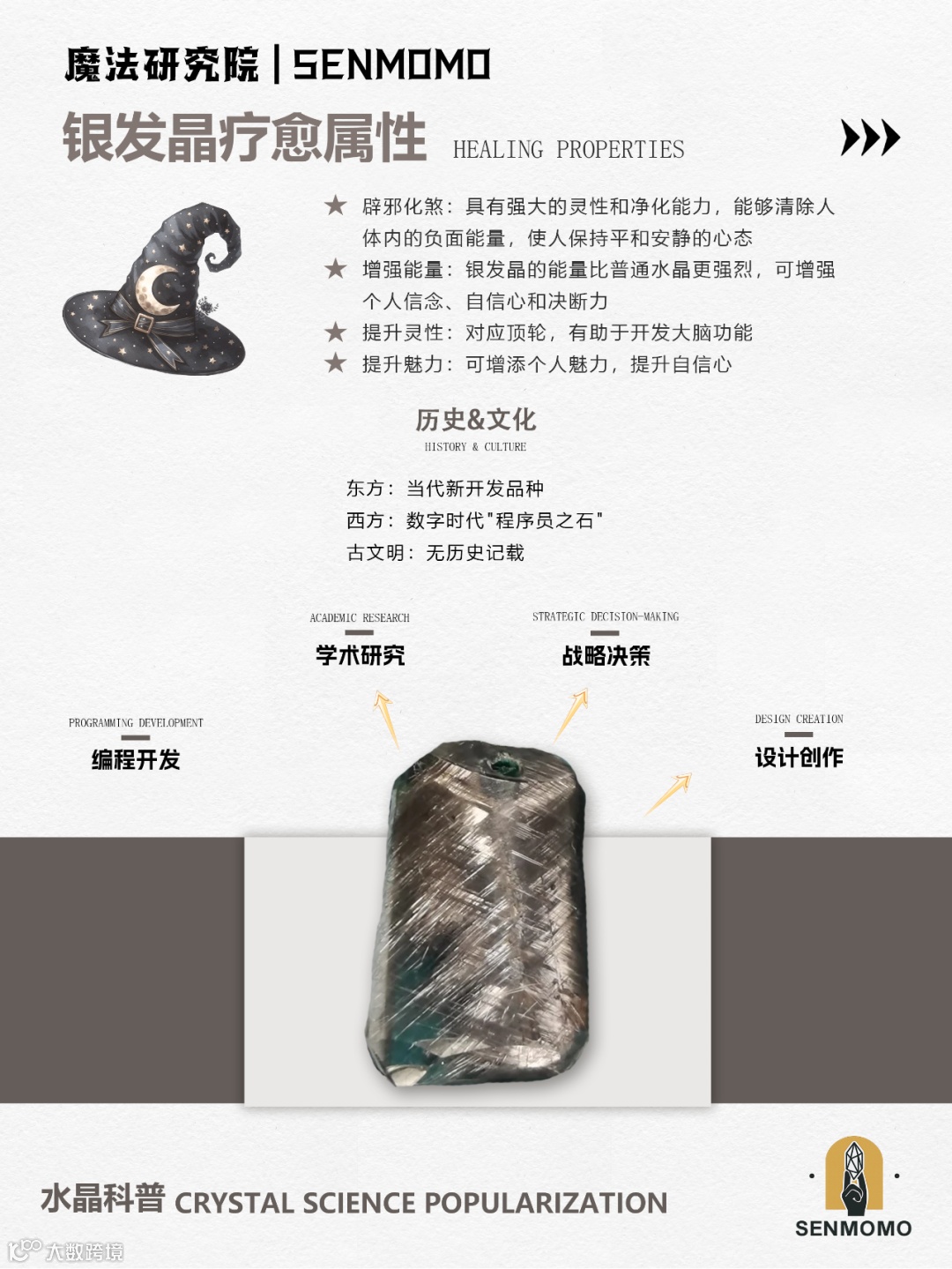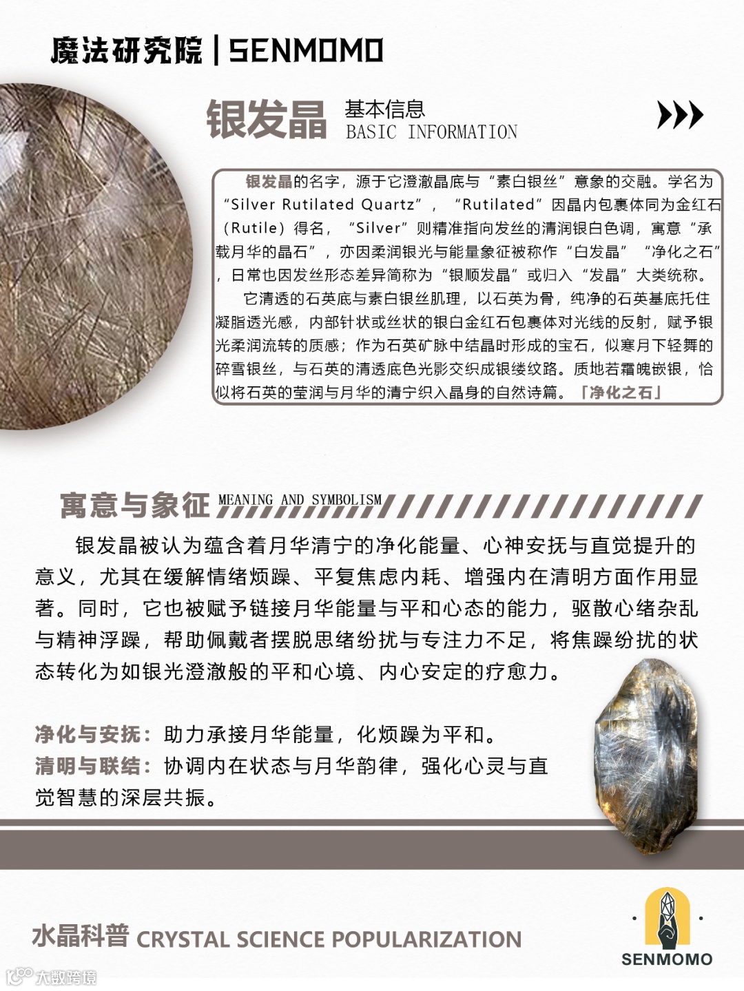 银发晶对应顶轮和眉心轮,能够帮助:提升智慧与洞察力,银色代表着清明与智慧,银发晶能增强逻辑思维和判断力;平衡情绪,其冷调的能量有助于平息焦躁、稳定情绪;增强沟通能力,帮助在交流中更加清晰、有条理地表达观点;促进自我反思,提供内省的力量,助力个人成长与提升。