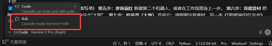 ② Ask模式:纯对话式交互,不生成代码[7]。