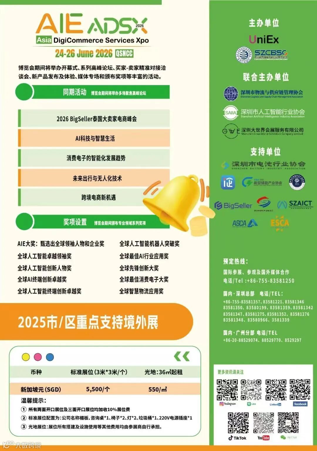 2026年6月24日至26日,AI消费电子与电商展(AIE)将在泰国曼谷诗丽吉王后国家会议中心举办[5]。展会设立人工智能、智能生活与消费电子、智能出行与汽车科技、新能源与储能、电商与数字商业五大展区,精准对接东南亚市场消费升级与技术应用需求[5]。