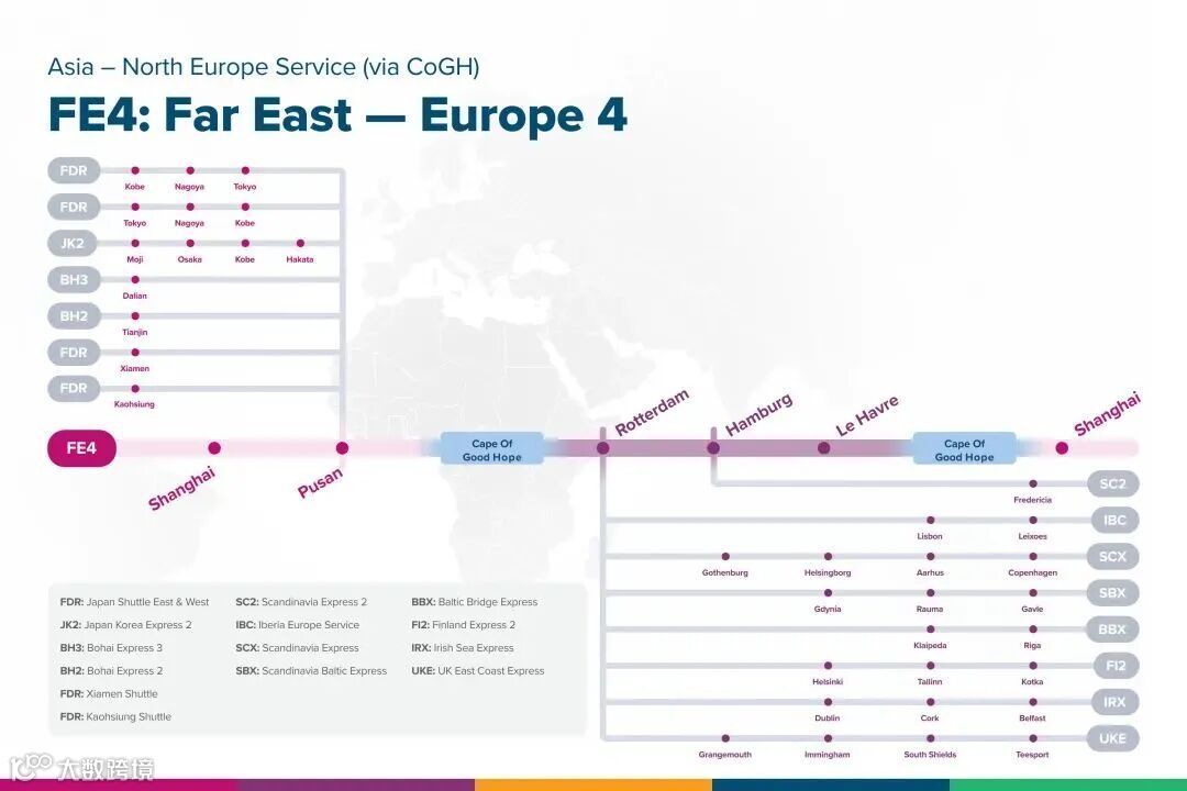 Qingdao—Ningbo—Yantian—Singapore—(Cape of Good Hope)—Algeciras—Felixstowe—Hamburg—Antwerp—(Cape of Good Hope)—Qingdao