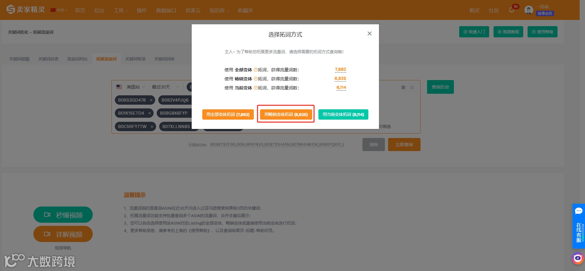 >>> 第三步:选择20个相似产品ASIN,点击拓展流量词,选择用畅销变体拓词