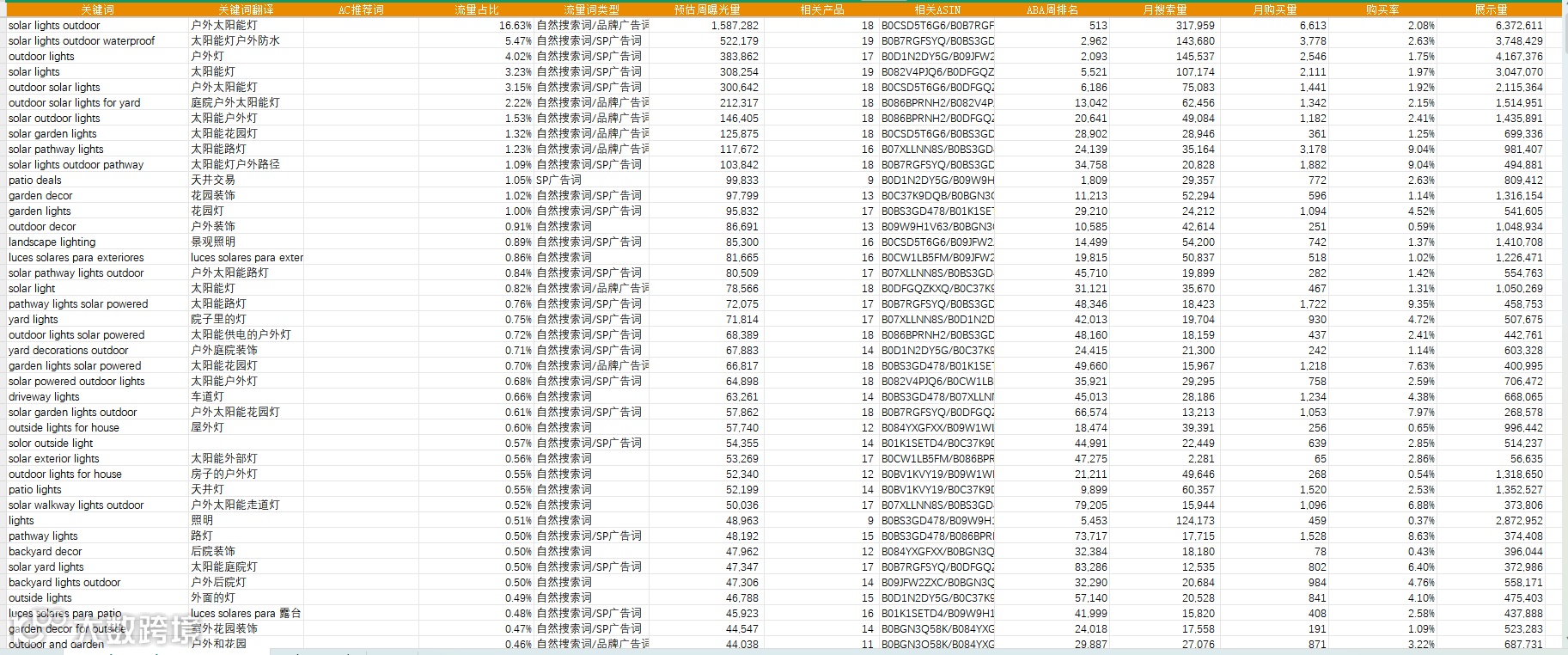 DeepSeek提示词示例:我刚从卖家精灵获取了太阳能户外灯类20名产品的关键词数据,请帮我分析这些数据并提供关键词布局策略。以下是关键词数据概要: