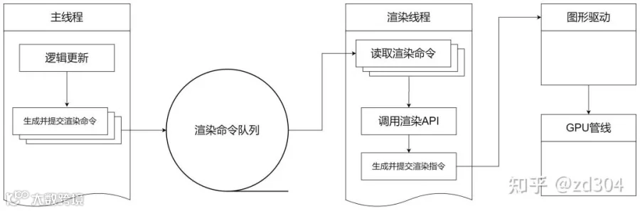 现代渲染API摒弃了传统的中心化“渲染上下文”设计,转而采用去中心化的“命令队列”机制,以支持高效的多线程渲染。这一变革使得游戏引擎能够将逻辑更新与渲染指令提交解耦至不同线程,最大限度降低相互影响,从而缓解因主线程等待导致的画面卡顿问题。
