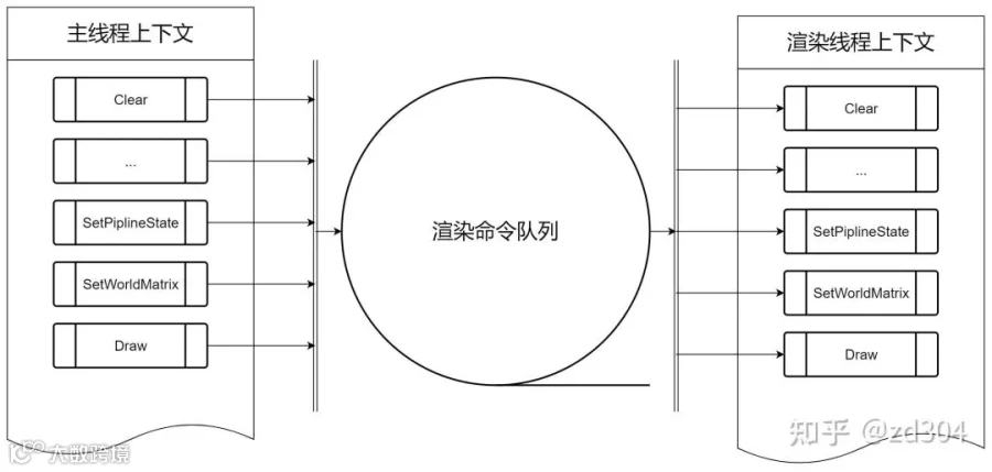 主线程与渲染线程各自拥有上下文对象,接口一一对应。例如主线程的Draw调用并不直接绘图,而是生成命令并通过RingBuffer传递给渲染线程,由后者调用其上下文的Draw接口完成实际绘制。