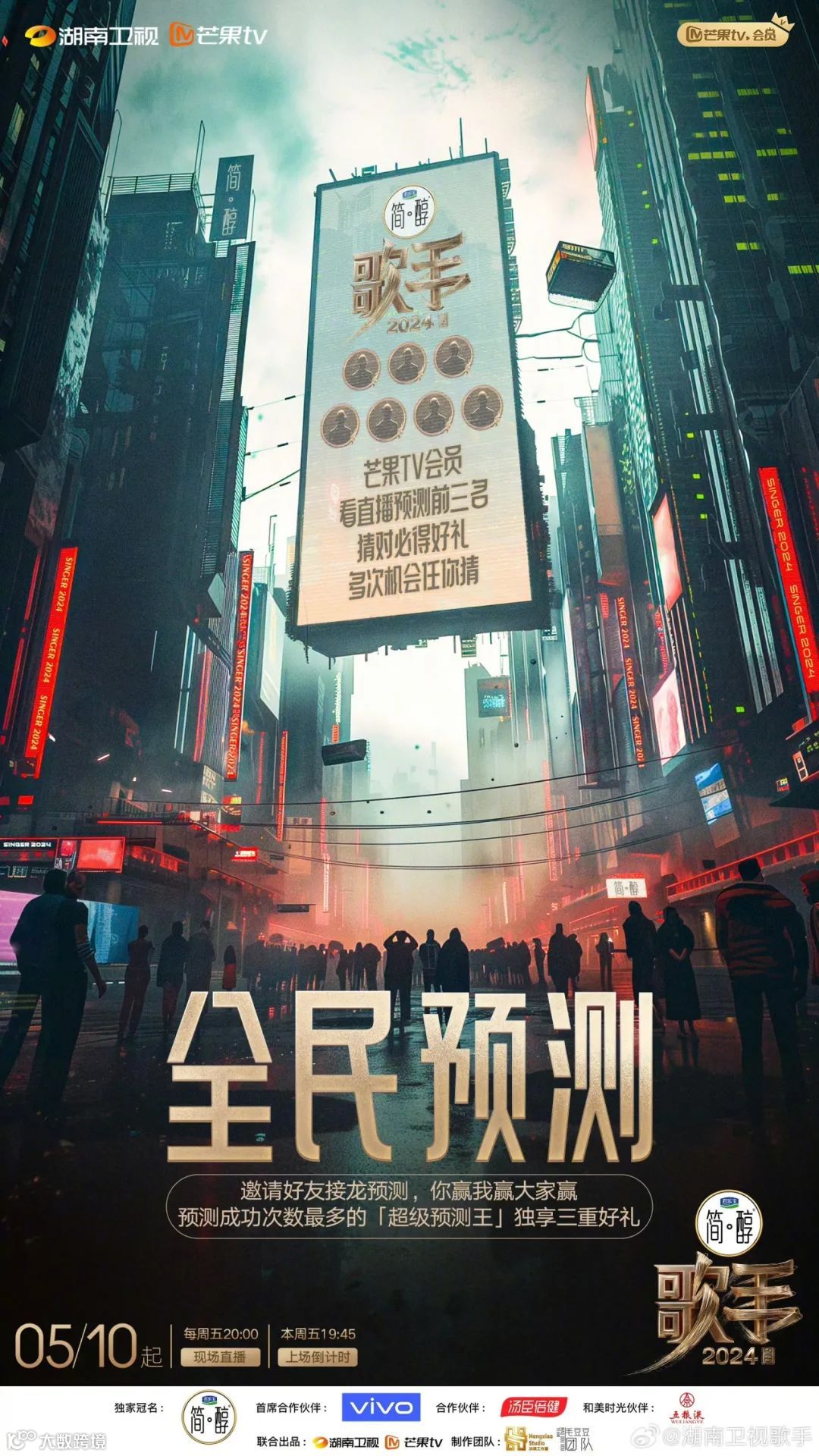 节目联合微博综艺发起#歌手2024请揭榜#,网友可点赞支持心仪歌手;携手QQ音乐推出#全民选曲#,由观众投票决定演唱曲目;同步上线#全民预测#,提升参与感并收集反馈用于节目优化。此外,长沙线下打卡、签绘墙等活动进一步拉近与粉丝的距离,强化品牌忠诚度。