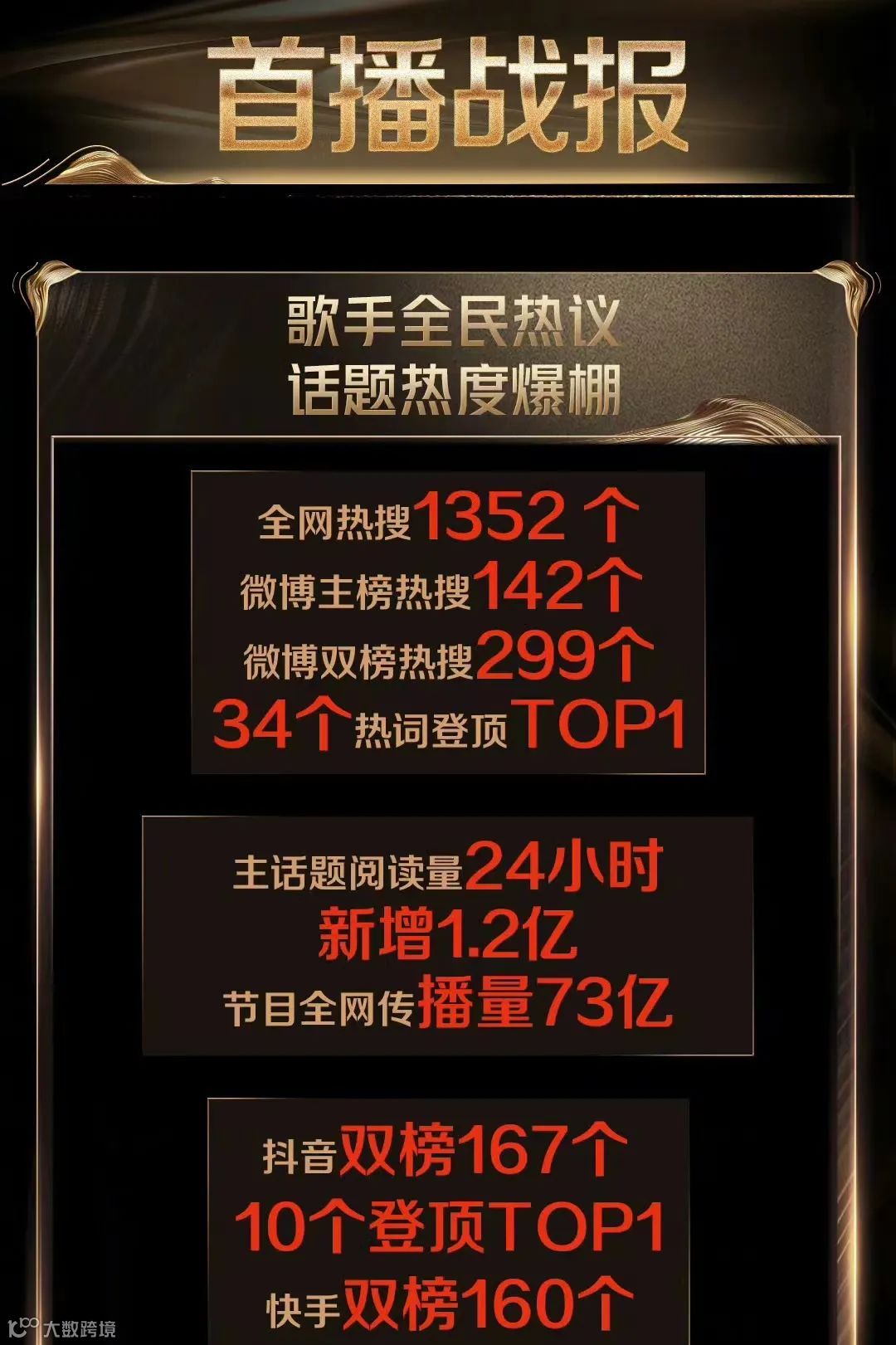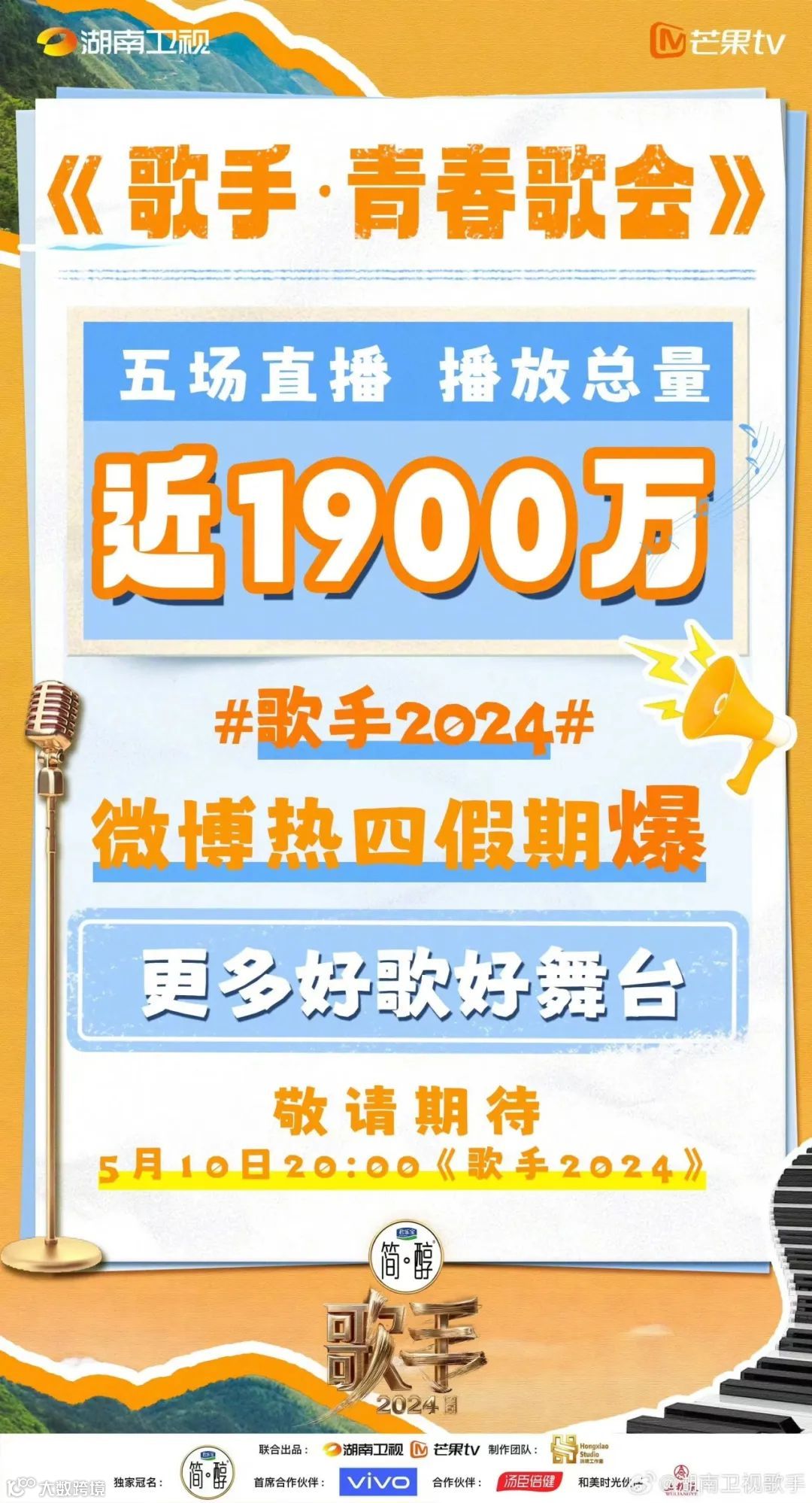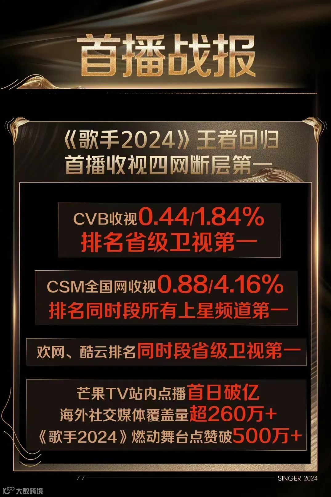 2024年5月10日,《歌手2024》开播即引爆全网,被视为近年来最具影响力的现象级音综,打破沉寂四年的市场格局。首播后迅速斩获全国收视第一,全网热搜达1352个,传播量超73亿,热度强势破圈。