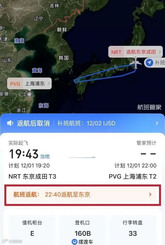 中文导报讯 12月1日,春秋航空从东京飞往上海的航班IJ005中途折返,没有继续飞往目的地上海,而是掉头飞回了成田机场。