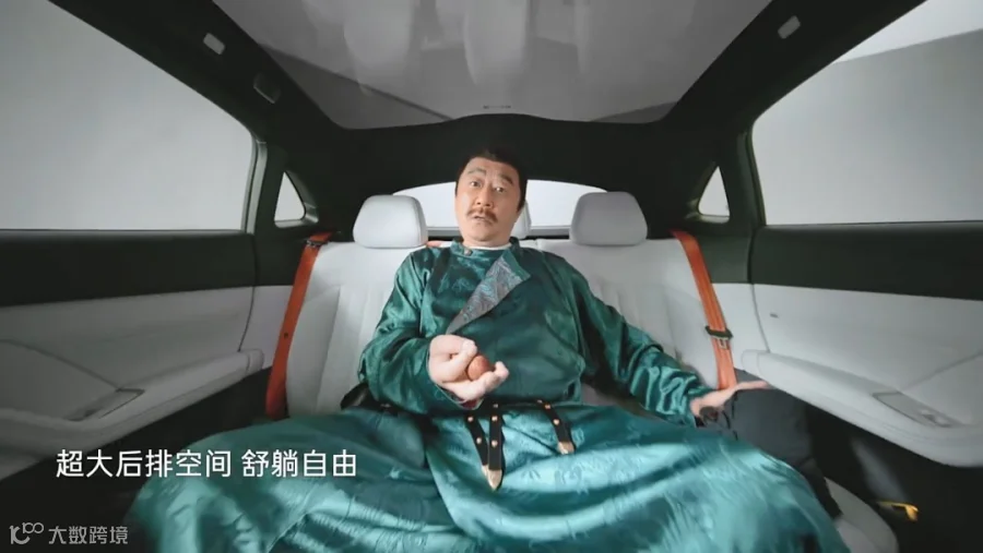 广告将“识人有术”转化为智驾系统解读,“格局要大”对应空间设计,实现“旧词新用”。语言学研究表明,此类表达可激活用户语义联想,提升信息接收效率。同时,严肃角色与荒诞场景的反差制造幽默感——如刘署令认真对车载语音喊“小乐,我要吃汉堡”,或在后座滑稽穿梭展示空间——有效降低消费者对商业信息的心理防御,增强情感连接,促进社交化传播。