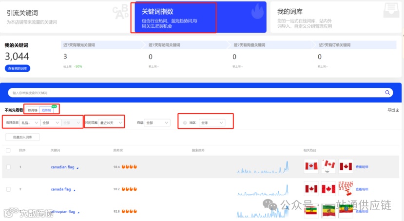 通过“产品参谋-选词参谋”查看目标市场关键词搜索热度与趋势变化。