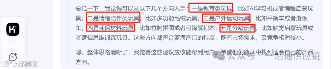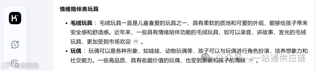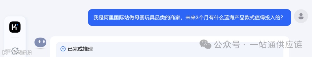 提问“未来3个月值得投入的蓝海产品”时,Kimi准确推荐情绪陪伴类玩具,契合阿里国际站母婴&玩具类目爆款定招方向。