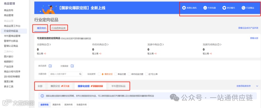 阿里国际站定期发布“行业定向征品”,入选商品可获流量扶持。