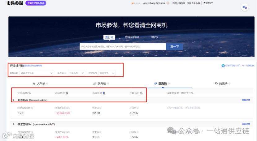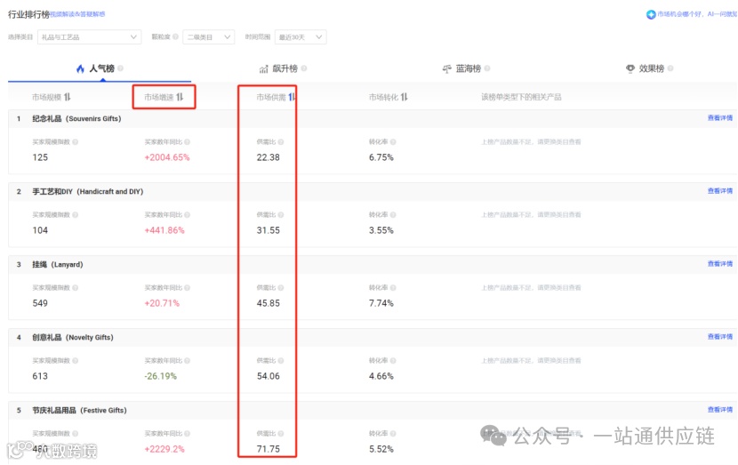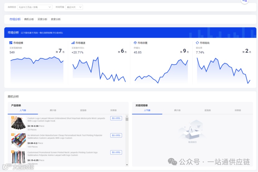 - 按市场规模、增速、供需比、转化率排序筛选;