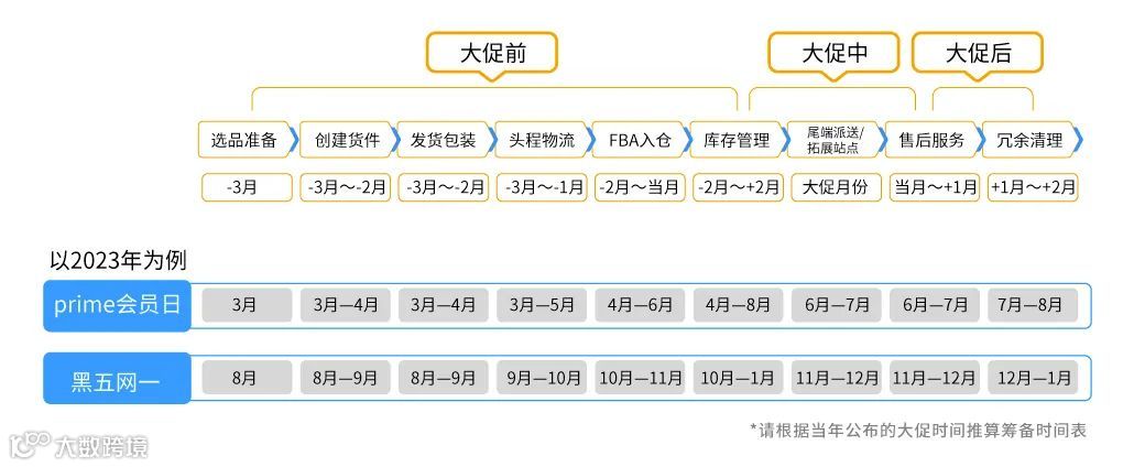 为确保商品能够顺利入仓,合理的物流时间安排至关重要。亚马逊物流建议,大促活动前至少三个月就应开始选品准备工作。根据大促的前、中、后三个不同阶段,需制定全面的物流计划,并精准把控各个关键节点和节奏。以下是我们为大家提供的建议时间表,可作为参考: