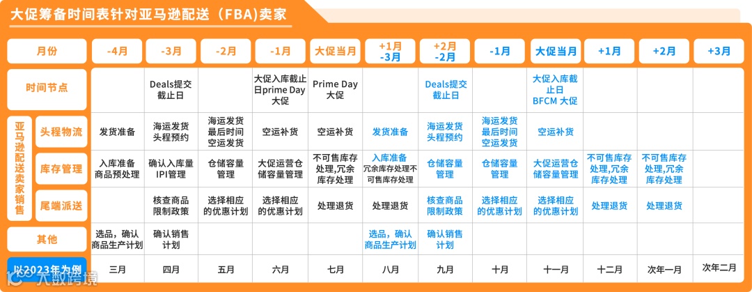 对于使用亚马逊配送(FBA)的卖家而言,大促活动前的一个月是关键时期,因为此时是商品入库的截止期限。因此,卖家必须提前规划并做好商品的发货、入库准备工作,以及对商品进行适当的预处理。为了帮助FBA卖家有序地应对大促活动,我们根据全年的大促时间节点,制定了以下详细的时间表建议。该时间表具体到每个月需要完成的任务,以确保卖家能够有条不紊地准备并迎接大促的到来。