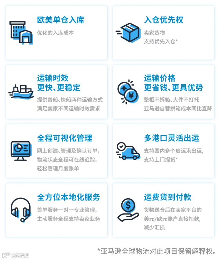 为了帮助卖家与FBA网络实现无缝对接,并持续优化跨境供应链管理,今年AGL特别为美国站点的卖家推出了一款全新的综合货件解决方案——亚马逊优享入仓(AMP)。值得一提的是,使用AGL的亚马逊优享入仓(AMP)服务时,所需支付的费用已包含配置入库的相关目的地费用,因此不再额外收取FBA入库配置服务费。在卖家满足一定运输条件的情况下,这一方案有助于降低入库配置的成本。