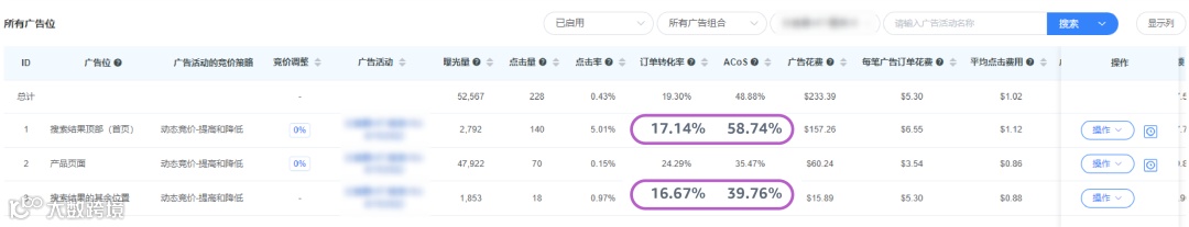 竞价策略:对三大广告位的曝光量、点击率、转化率和ACOS进行对比分析,根据不同位置的表现调整动态竞价策略,以实现更高效的广告投放。