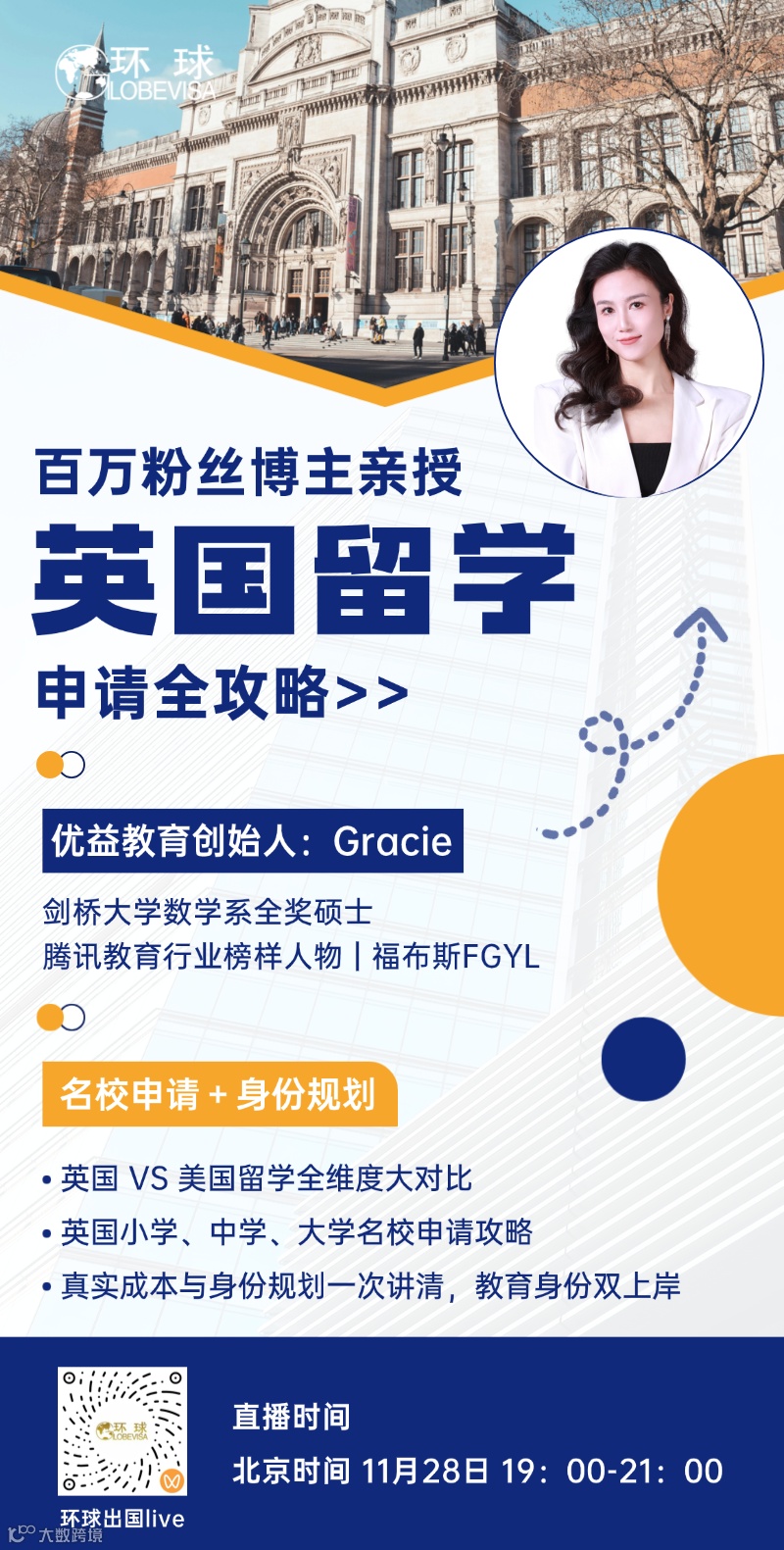 亲爱的家长和学子们,是否在英美留学选择中徘徊不定?是否担心孩子毕业后身份规划难题?11月28日19:00-21:00,优益教育创始人Gracie Chen——剑桥大学全奖硕士、腾讯教育行业榜样人物,将携独家数据与实战案例,在线深度解析英国教育与身份双规划路径!一场直播,解决留学+身份两大核心焦虑!