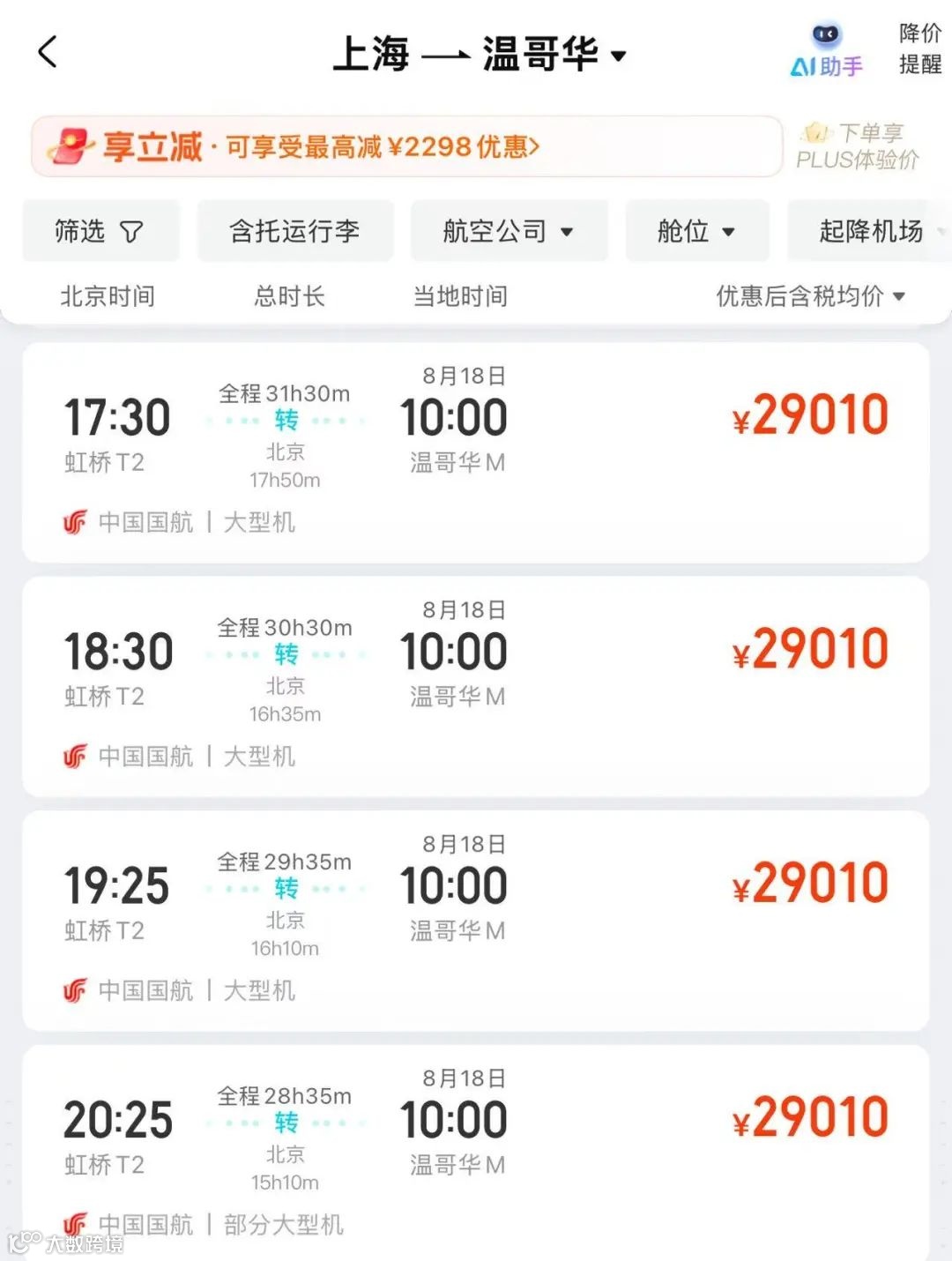 l北京-温哥华:国航8月22日前经济舱售罄,22日公务舱报价超4万元;