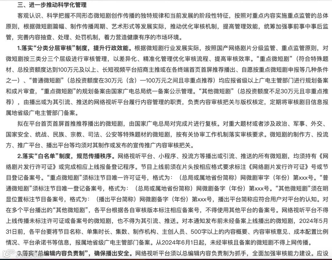在监管方面,通知重申落实“分类分层审核”制度,将微短剧分为三类进行分级管理: