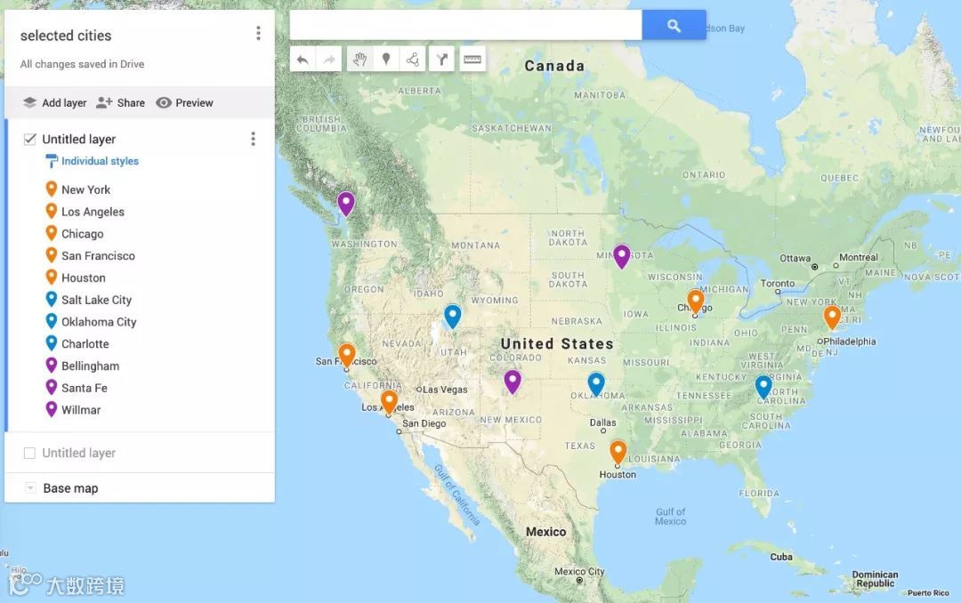 橙色为大城市、蓝色为中等城市、紫色为小城市