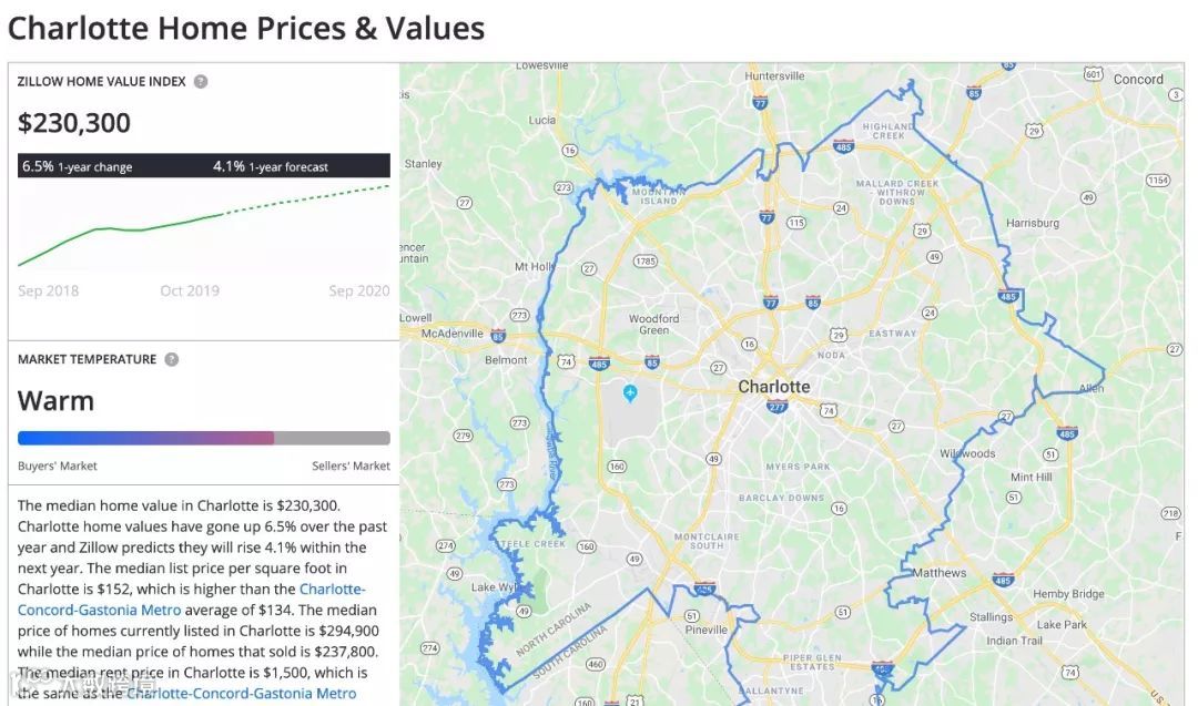 夏洛特是美国东海岸典型的中等城市,市区人口61万,都会区人口152万。当地房价相对温和,住房中位价约23万美元。