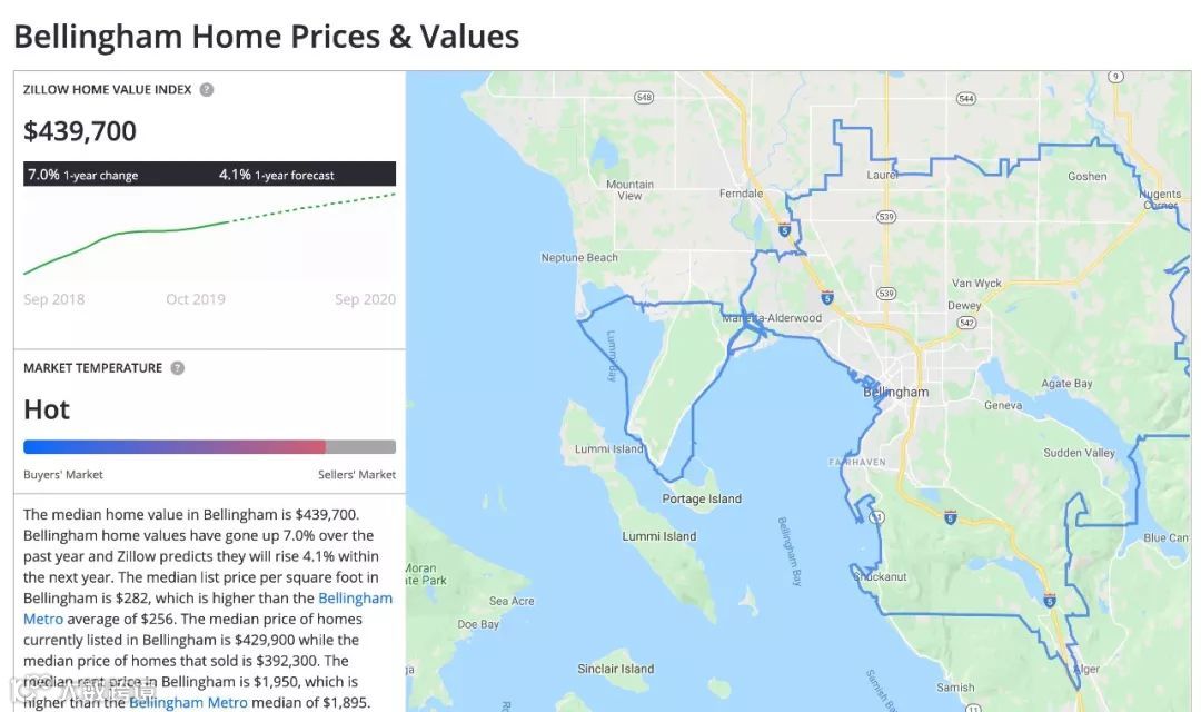 位于华盛顿州的贝灵翰姆市区人口约9万,住房中位价达43.97万美元,因其地处西雅图与加拿大温哥华之间,成为两大都市的卫星城,房价受辐射效应显著推高。