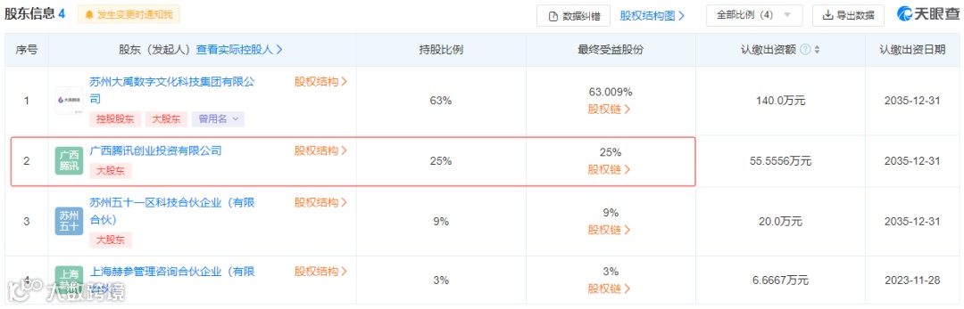 天眼查信息显示,腾讯在11月底进一步增持苏州五十一区网络科技有限公司股份,持股比例由20%提升至25%,继续位列公司第二大股东。腾讯首次投资五十一区网络是在2021年10月,当时公司注册资本从160万元增至200万元。
