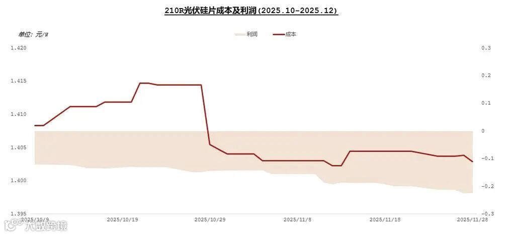 据SMM硅片日度成本,以210R尺寸为例,10月不含税完全成本从1.408元/片降至12月的1.403元/片,利润率却从-12.03%扩大至-22.41%。数据表明,同期210R硅成本、非硅成本、三费占比为49%、48%、3%,比例基本未发生变化,辅材坩埚价格和气体价格波动可以忽略不记。因此利润大幅下滑的核心原因在于硅片售价大幅下跌,通过上图也可以看出,210R硅片含税售价从1.4元/片降至1.23元/片,降幅达12.1%。SMM根据市场调研,预期12月210R成本受坩埚降价影响有小幅下降空间,利润有向上修复空间,但具体仍需关注本轮涨价能否为电池企业所接受。