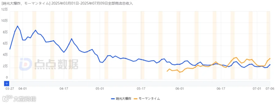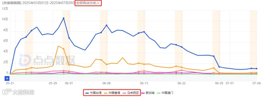 出海方面,《时光大爆炸》3月27日登陆港澳台,首月流水1481万元;5月27日进入日本市场,首月520万元。尽管日本开局较弱,但呈缓步上升趋势,当前日流水26.1万元已超过港澳台,显示出较强潜力。