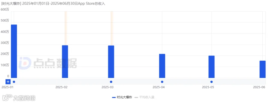 《时光大爆炸》累计iOS流水与《永远的蔚蓝星球》相当,但首月(1月2日公测)仅录得3510万元,为后者33.11%,位列梯队末尾。近三个月流水下滑趋缓,当前月流水约1100万元。