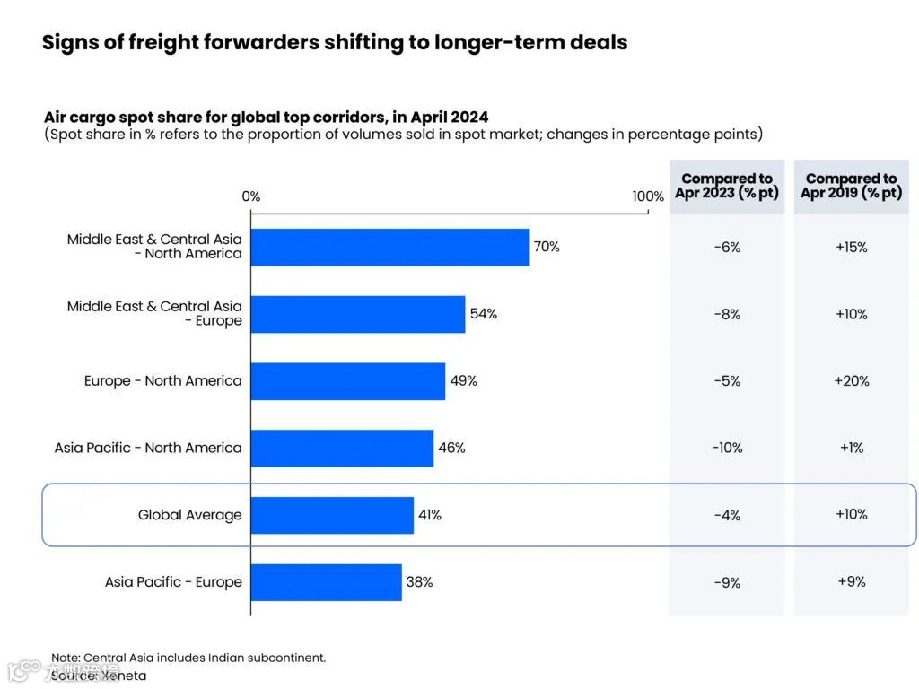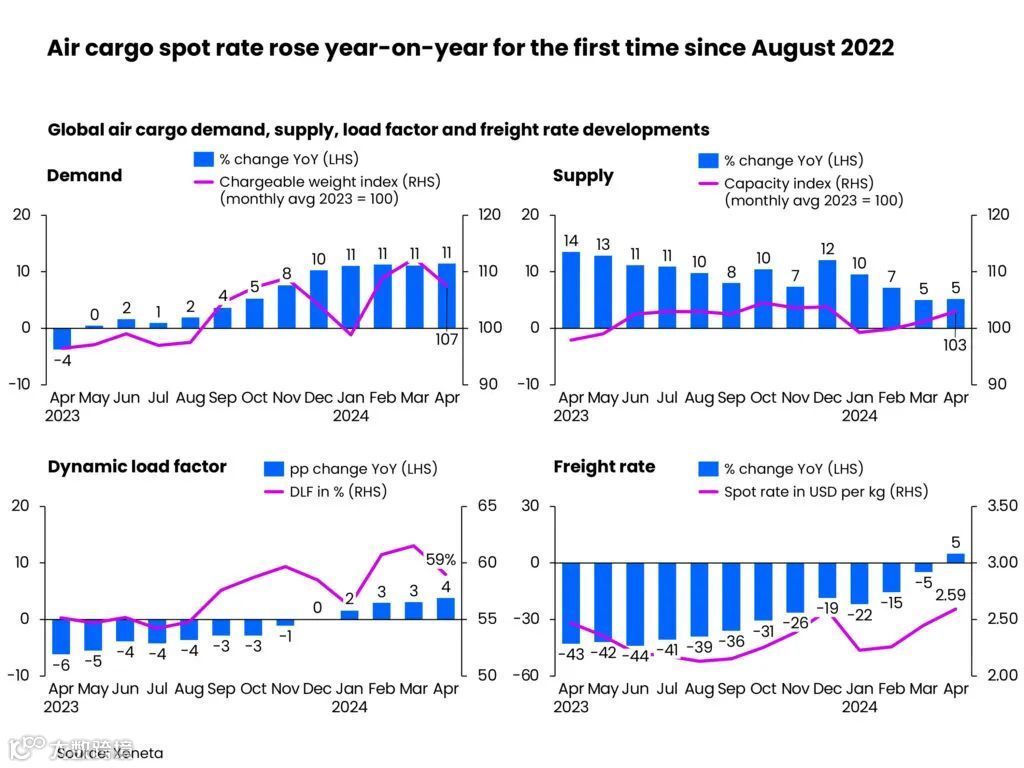 今年4月,由于中东冲突和强劲的电商需求,全球航空货运现货价格同比增长5%,这是自2022年8月以来首次呈现正增长趋势。全球航空货运平均现货价格升至每公斤2.59美元,为今年以来的最高水平。不过,即期运费的增长应该放在2023年4月市场疲软的背景下来看待。