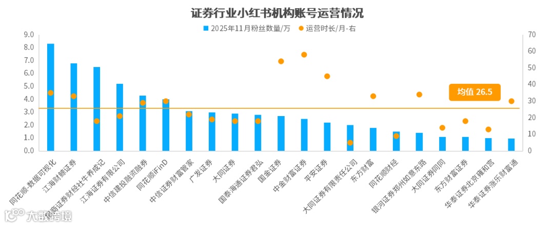 在证券行业中,头部小红书官方号的运营时长普遍较短,粉丝量超过1万的账号运营时长平均26.5个月,比头部券商抖音号短12.2个月。