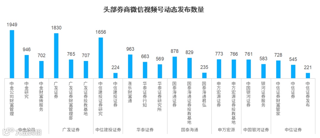 具体来看,中金公司、广发证券、华泰证券的视频号建设都相对完整,官方账号通常在3个以上,涵盖品牌、研究、投教、服务、财富管理等方向。其他几家头部券商的视频号作品发布也相对较多。