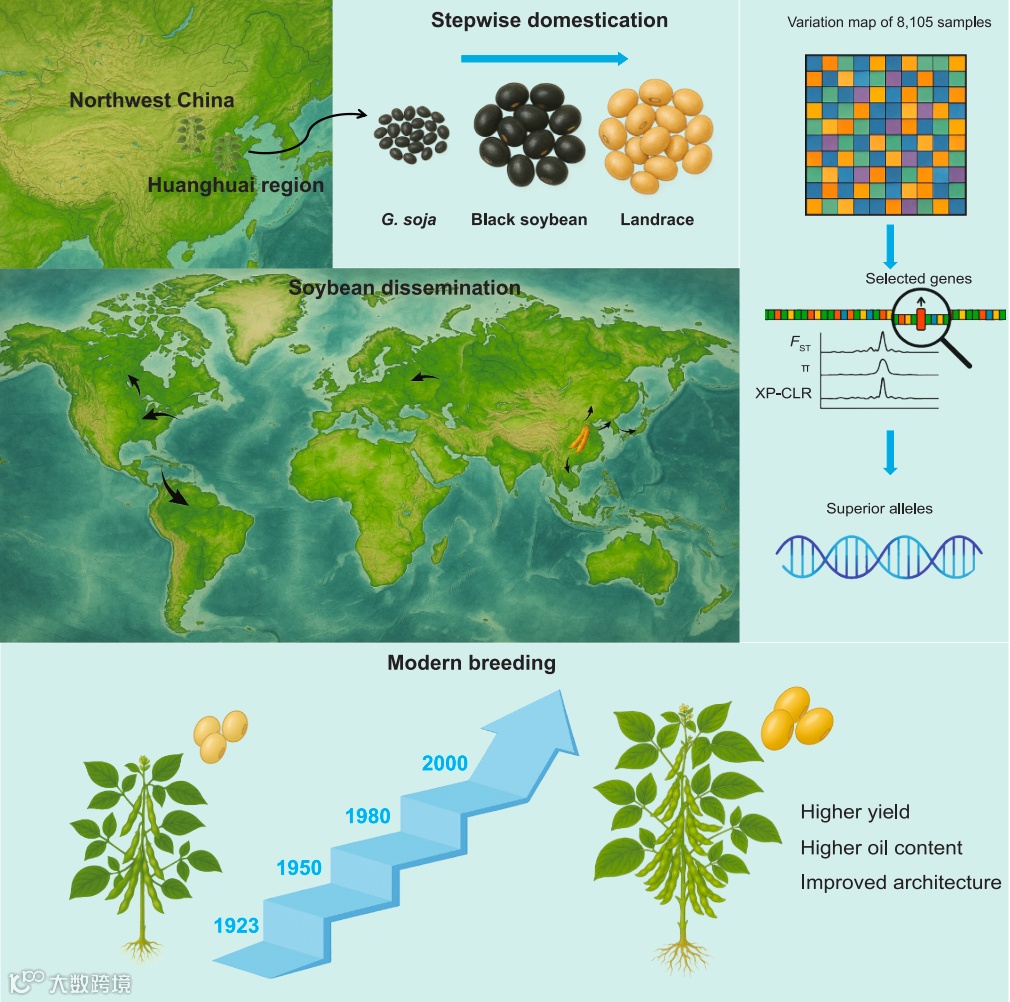 如今,经过数千年的驯化、传播和改良,大豆已成为一种在全球具有重要意义的豆科作物,是人类食用和动物饲料的主要蛋白质和油脂来源。探究大豆如何适应多样的种植环境和育种目标,将有助于未来育种工作的推进。