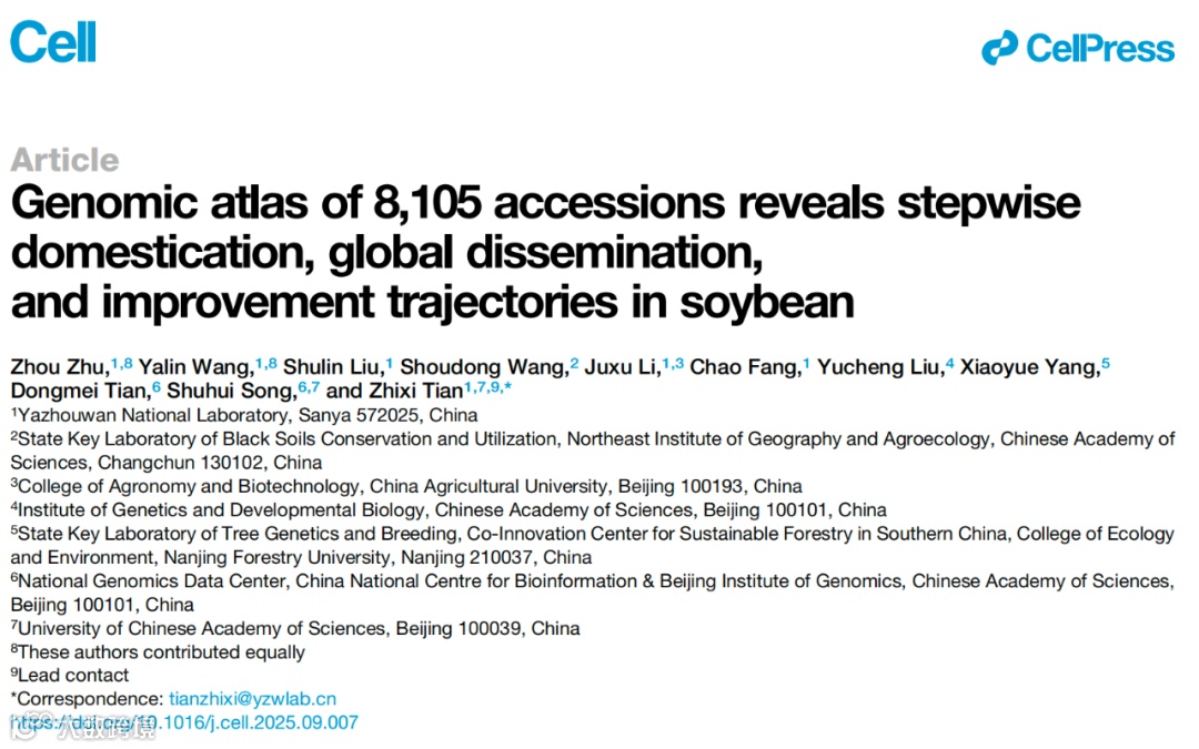 经过数千年的驯化,大豆已成为一种在全球具有重要意义的作物,以其出色的适应性而闻名。在这项研究中,研究团队通过对 8105 份大豆样本的分析,揭示了大豆适应性和改良的关键基因。封面图片展示的是在黑龙江省自然光照条件下生长的大豆植株,该图片既展现了大豆植株的自然之美,也反映了能够指导未来育种工作和可持续农业发展的遗传学见解。