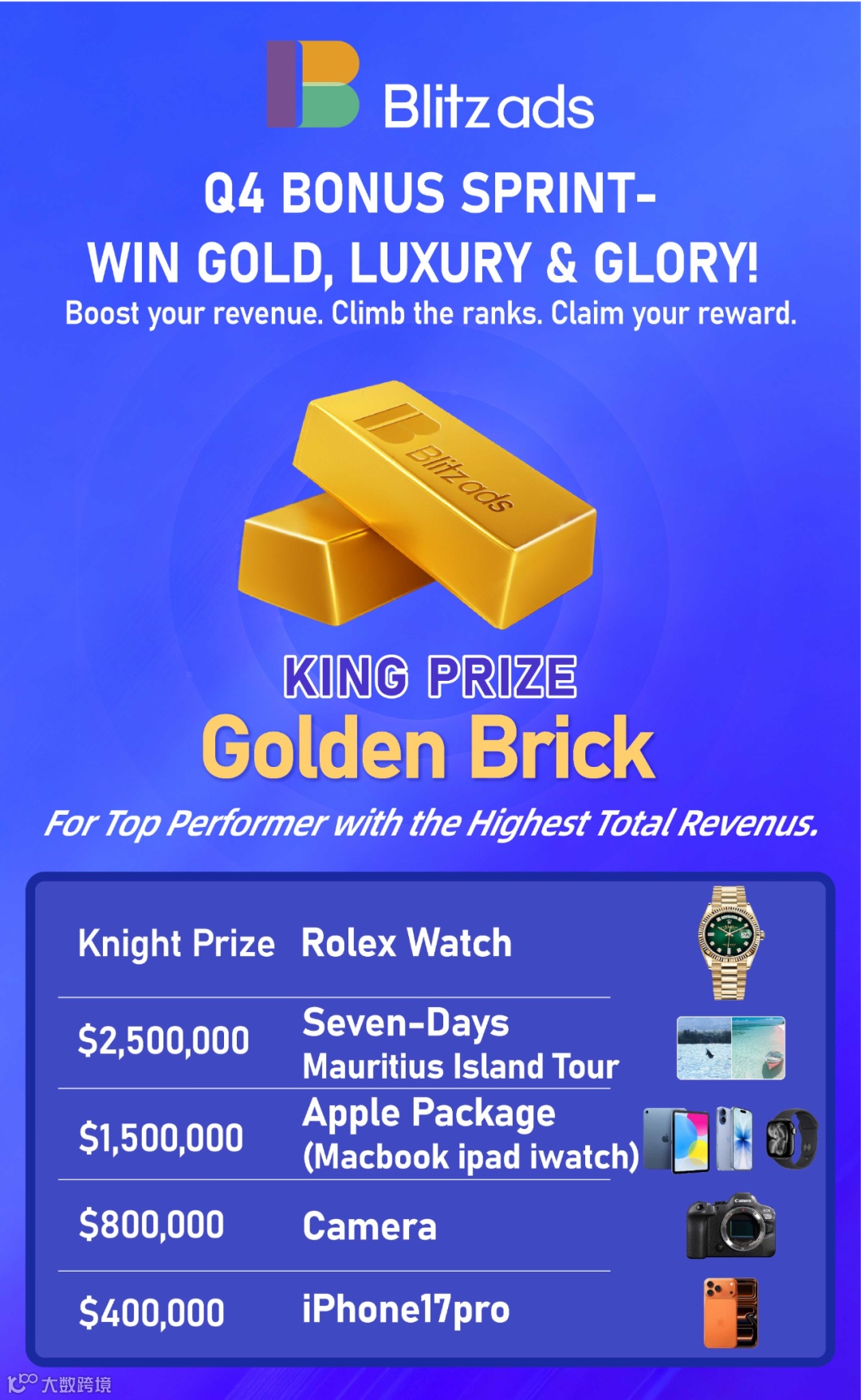 2025 Blitzads 冲量大赛重磅启幕!百万奖金池直接翻倍,终极大奖升级成沉甸甸的金砖!去年的奖品够硬核,今年的奖励更炸裂!你的每一份战绩,都该配得上 “黄金级” 回馈!
